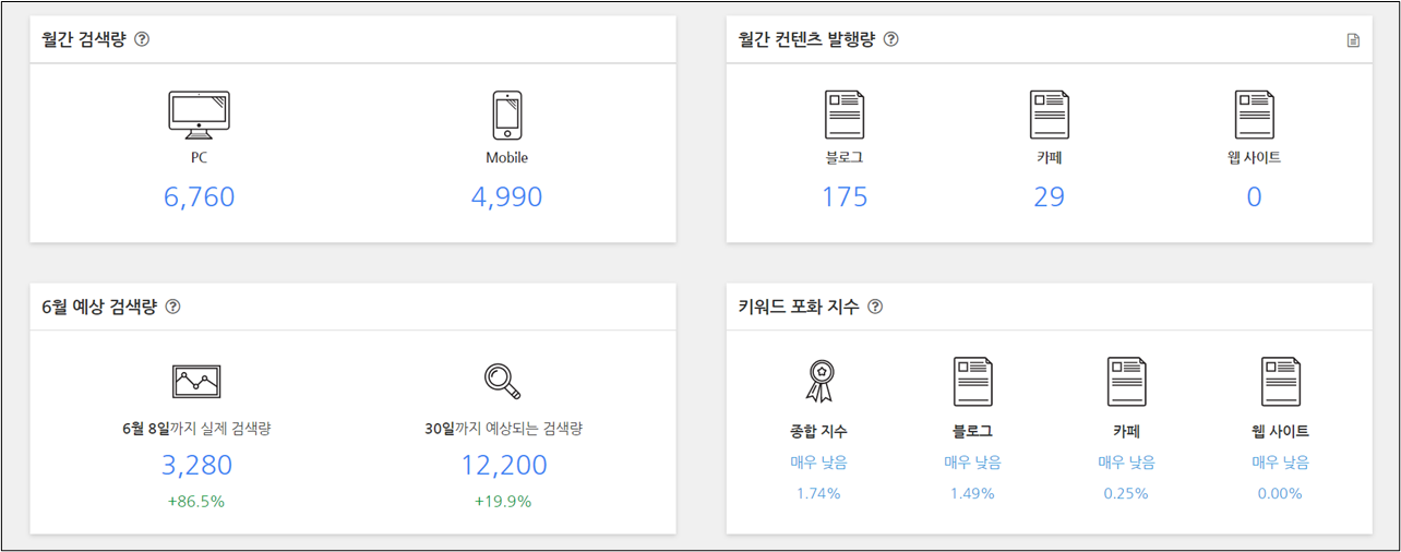 - 검색수 대비 블로그 / 카페 등 문서 발행량을 한번에 비교할 수 있다.