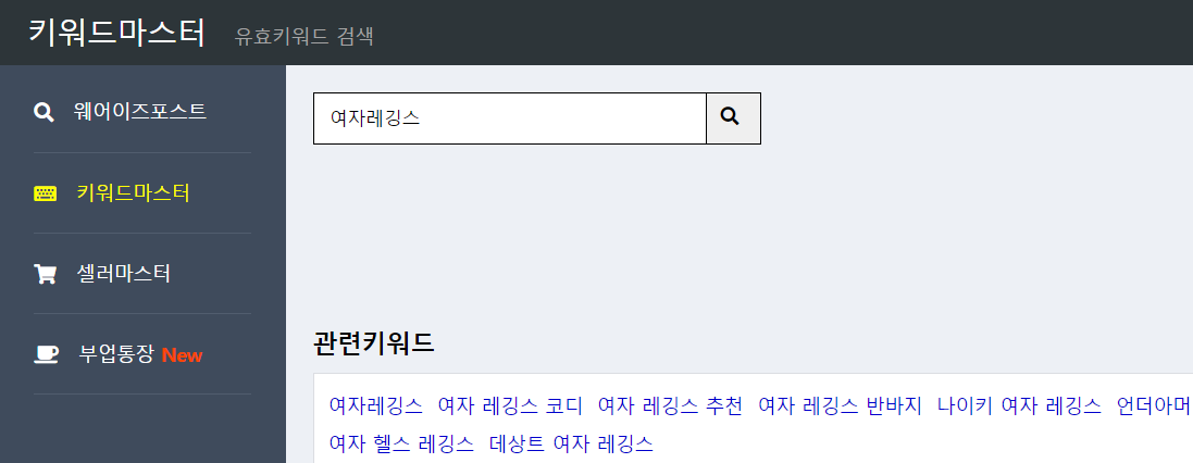 - ex. 내가 여자 레깅스를 팔고 싶거나 여자 레깅스 관련 트렌드를 조사한다고 가정하면 '여자 레깅스' 와 관련된 상품 키워드를 파악할 수 있다.